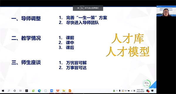 为满足部分同学的现实需求和意向选择,大会首先向全体同学公布了新一轮专业完全导师双选调整名单,并对后续工作进行了安排部署;其次,向全体同学通报了专业教师在本学期在线听课、巡课中发现的问题,对学生们提出的问题进行了耐心细致地解答;最后,张思佳老师指出,各位导师要尽快完善新的“一生一策”方案,调整的同学要尽快融入新导师团队,同时希望全体同学善于发掘自身优势,规划好大学生活,严于律己,形成合力,以取得更大的进步。