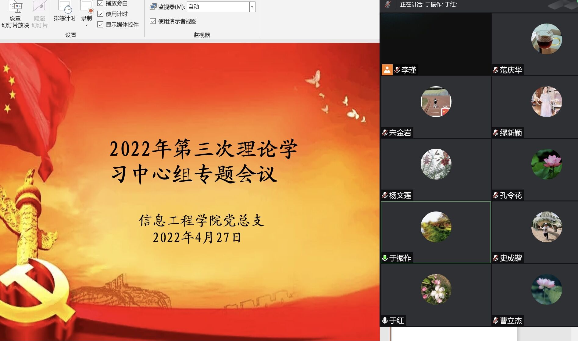 427日,信息工程乐鱼网页版党总支在腾讯会议线上召开了2022年第三次理论学习中心组专题学习会议,本次会议由党总支书记于振作主持,理论中心组全体成员参加了会议。