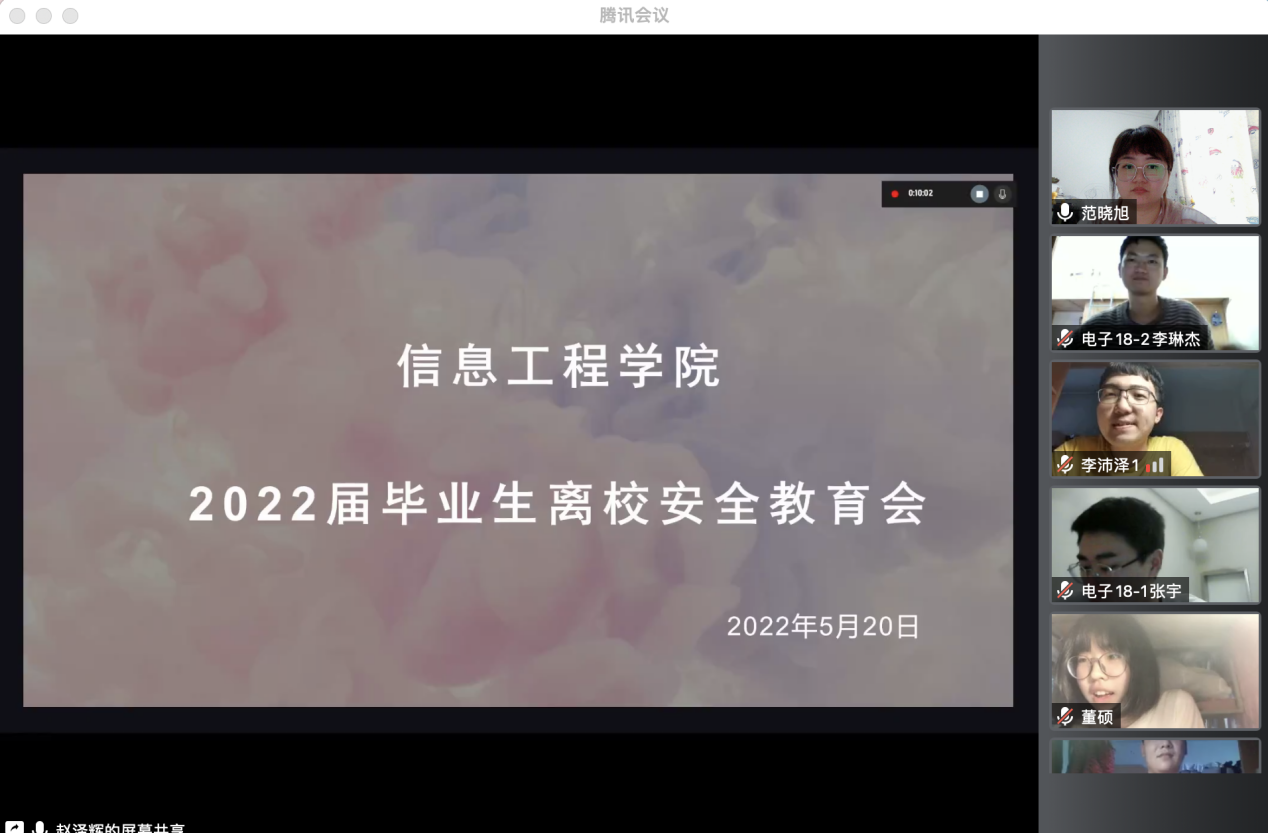 信息工程乐鱼网页版于20225201800通过腾讯会议召开毕业生离校安全教育会,会议由2018级辅导员范晓旭主持,全体毕业生参加会议。