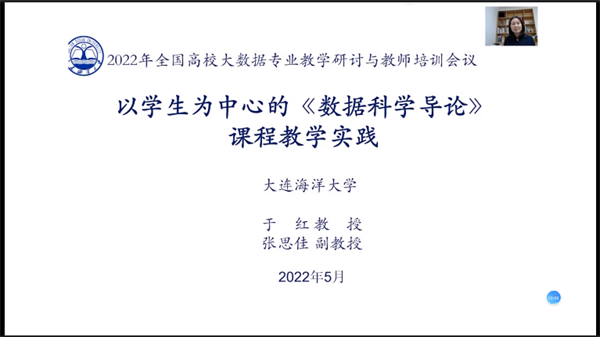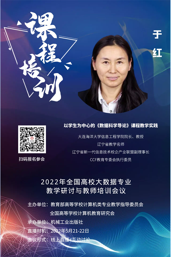 2022年5月21日,为深入贯彻落实全国教育大会精神和新时代全国高校本科教育工作会议精神,践行教学创新理念,聚焦新工科,助力高校一流课程建设,提升高校教师教学能力,由教育部高等学校计算机类专业教学指导委员会和全国高等学校计算机教育研究会主办,机械工业出版社承办的“2022年全国高校大数据专业教学研讨与教师培训会议”通过线上直播方式召开。信息工程乐鱼网页版院长于红教授受邀参会,并做题为“以学生为中心的《数据科学导论》课程教学实践”课程培训。