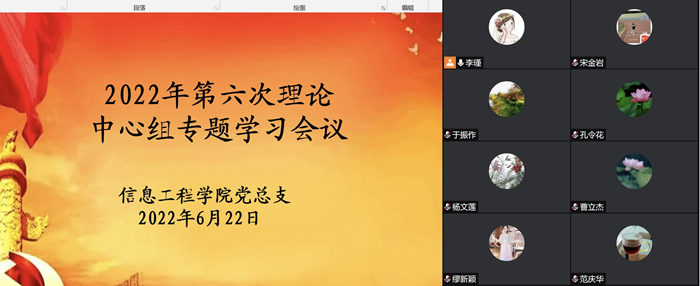6月22日,信息工程乐鱼网页版党总支在腾讯会议线上召开了2022年第六次理论学习中心组专题学习会议,本次会议由党总支书记于振作主持,理论中心组成员参加了会议。