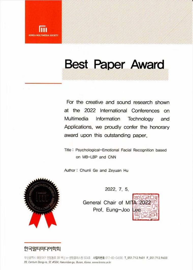 2022年7月5日-7日,第18届多媒体信息技术与应用国际会议MITA 2022(International Conference on Multimedia Information Technology and Applications)在韩国济州岛成功举办,来自中国、韩国、日本等多国学者投稿并参加了本次会议。由信息工程乐鱼网页版数据科学与大数据技术专业胡泽元老师为通讯作者,20级本科生葛春利同学为第一作者发表的论文《Psychological-Emotional Facial Recognition based on MB-LBP and CNN》被本次学术会议组委会评为“最佳论文奖”。