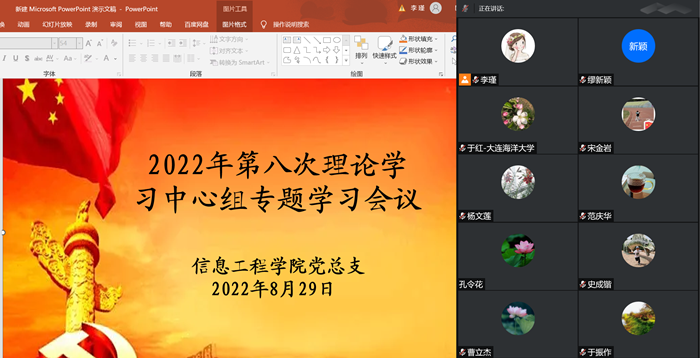 8月29日,信息工程乐鱼网页版党总支在腾讯会议线上召开了2022年第八次理论学习中心组专题学习会议,本次会议由党总支书记于振作主持,理论中心组全体成员参加了会议。