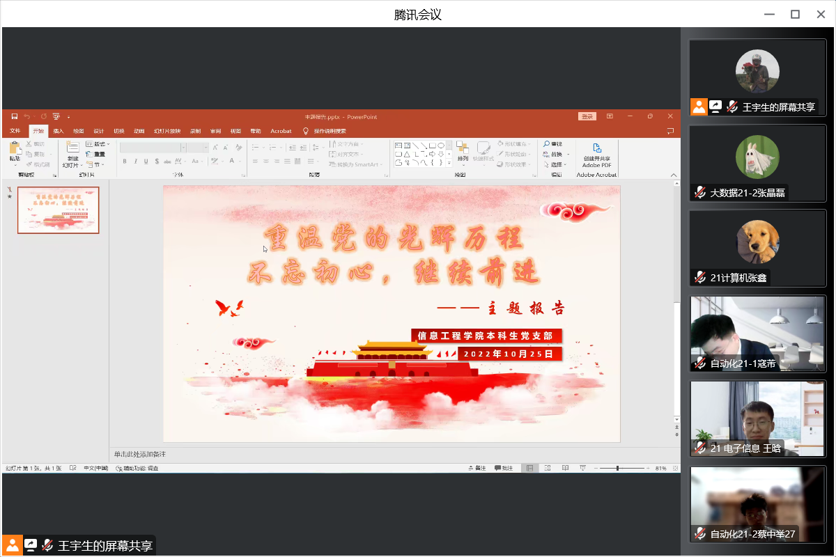 信息工程乐鱼网页版于2022年10月25日18:30以线上腾讯会议的形式召开了“重温党的光辉历程,不忘初心,继续前进”的主题会议。第十六期入党积极分子参加了本次报告会,马克思主义乐鱼网页版蔡静老师主讲。会议由学生会组织部部长王宇生主持。