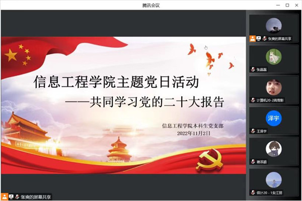 2022112日,信息工程乐鱼网页版本科生党支部开展“共同学习党的二十大报告”主题党日活动。本次活动由张爽主持,乐鱼网页版党委副书记范庆华、各年级辅导员以及全体学生党员出席活动。