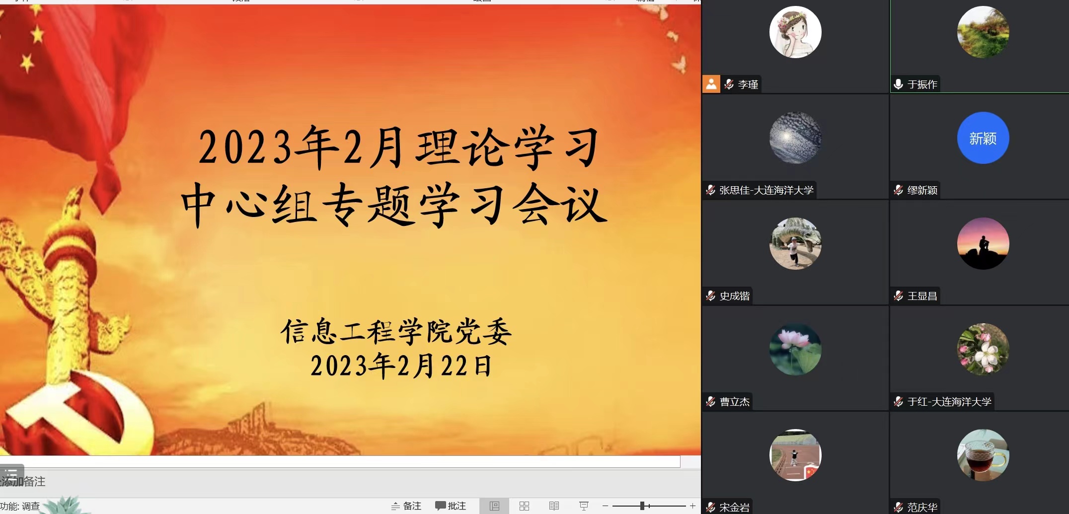 2月22日,信息工程乐鱼网页版党委在腾讯会议线上召开了2023年2月理论学习中心组专题学习会议,本次会议由党委书记于振作主持,理论中心组全体成员参加了会议。