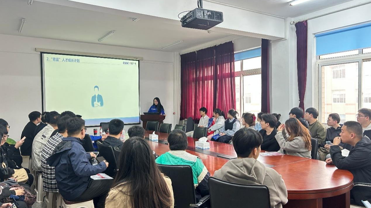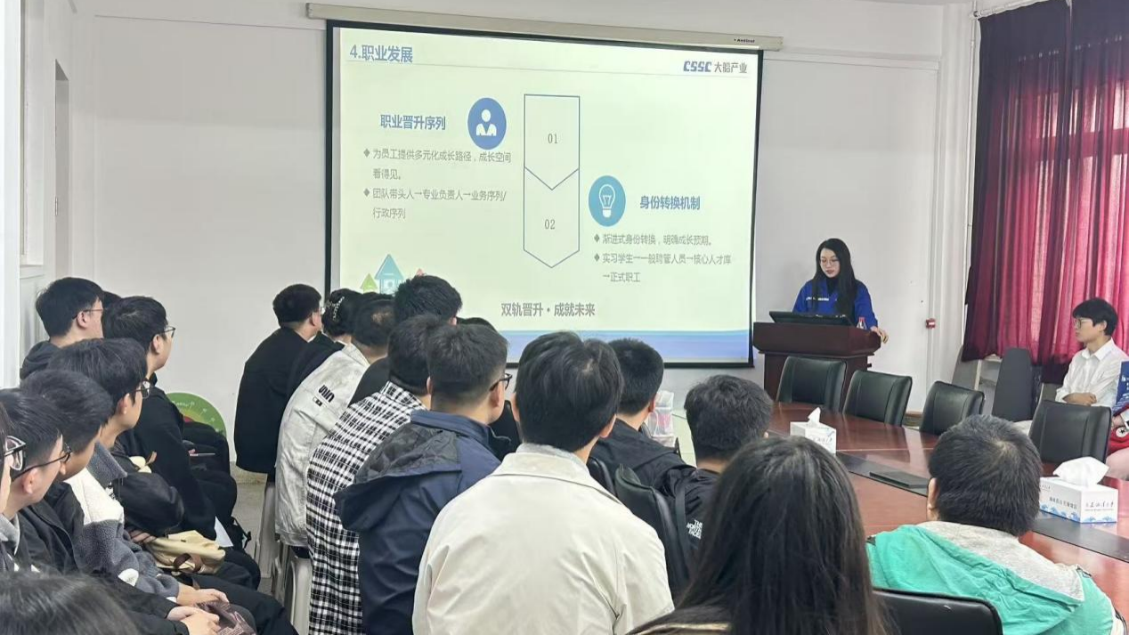 大连船舶重工有限公司工作人员通过播放企业宣传片与现场讲解等方式,有效帮助在场学生直观地建立起对船舶领域发展前景的认知。通过对本次校招“青蓝”人才成长计划与薪资结构进行详细地解读,帮助学生形成较为清晰的职业发展方向认知,强化了岗位吸引力。