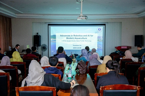培训采取“实地考察+理论授课+技能实操”的多元化模式。林远山带领学员赴大连鑫玉龙公司现场教学,深入参观海参海洋牧场、科技馆及培育基地。直观的现场考察让印尼学员对中国现代化、规模化水产养殖模式有了深刻认识,切身感受了中国现代渔业的发展速度;理论教学环节,林远山作了《Advances in Robotics and AI for Modern Aquaculture》(现代水产养殖中的机器人与人工智能进展)全英文学术讲座,深入浅出地阐述了机器人与AI算法在水产养殖全流程的创新应用,引发了学员们的热烈反响。