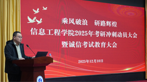 为鼓舞考研学子士气、筑牢诚信根基,信息工程乐鱼网页版于12月10日在黑石礁校区图书馆报告厅召开2025年考研冲刺动员暨诚信考试教育大会。乐鱼网页版党委副书记王建东、2022级辅导员宋子奇、2026届考研毕业生参加此次大会。会议由宋子奇主持。